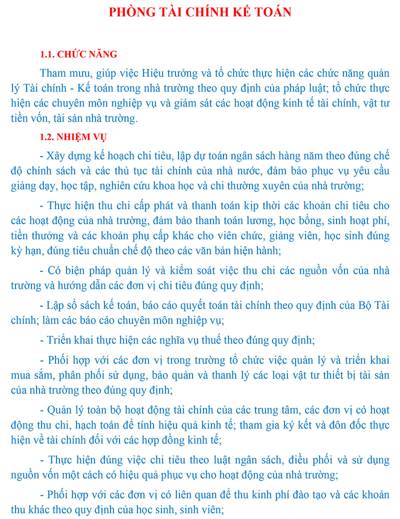 Phòng Tài chính kế toán là đơn vị tham mưu giúp việc cho lãnh đạo đơn vị thực hiện chức năng tổ chức và quản lý công tác tài chính, tài sản.