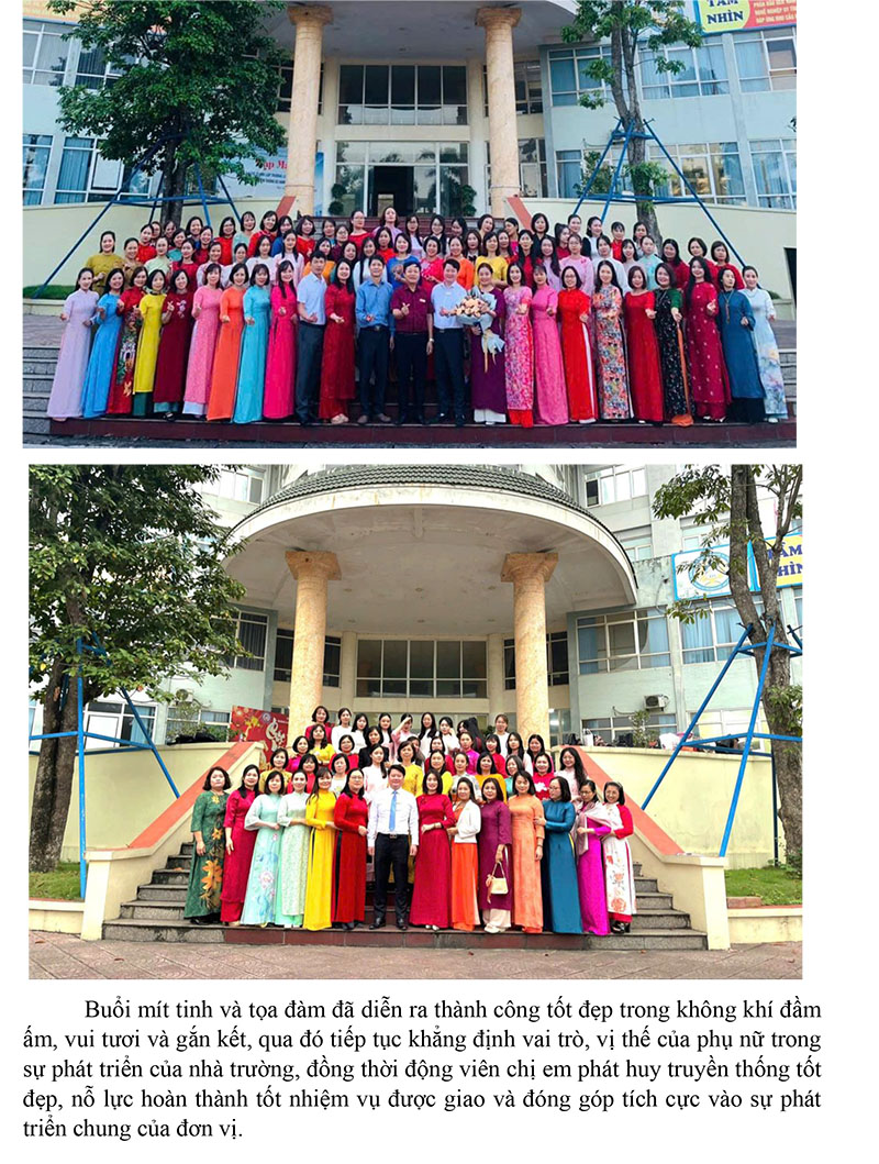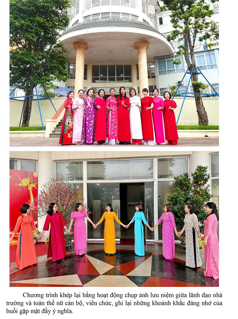 Hưởng ứng “Tuần lễ Áo dài”, các nữ cán bộ, viên chức và người lao động của nhà trường đã duyên dáng khoác lên mình những tà áo dài truyền thống với nhiều màu sắc rực rỡ. Hình ảnh những tà áo dài thướt tha không chỉ tôn lên vẻ đẹp dịu dàng, thanh lịch của người phụ nữ Việt Nam mà còn góp phần lan tỏa và gìn giữ giá trị văn hóa truyền thống.
