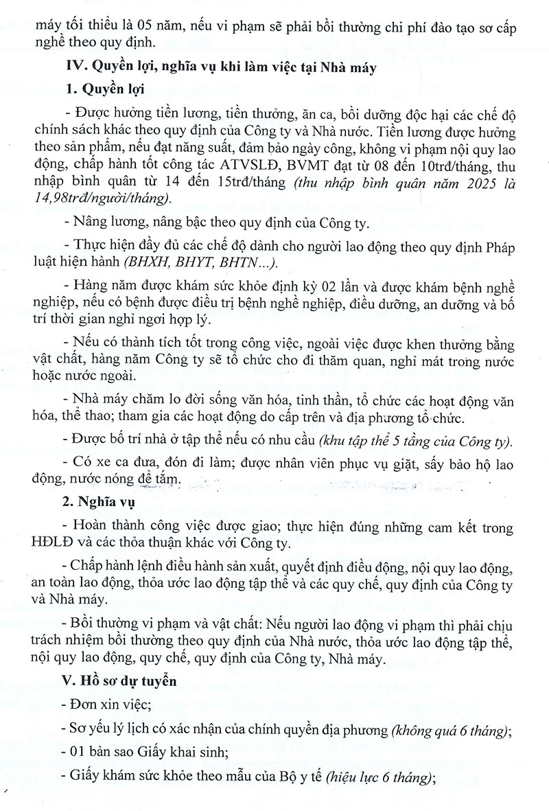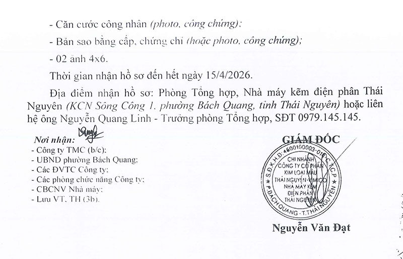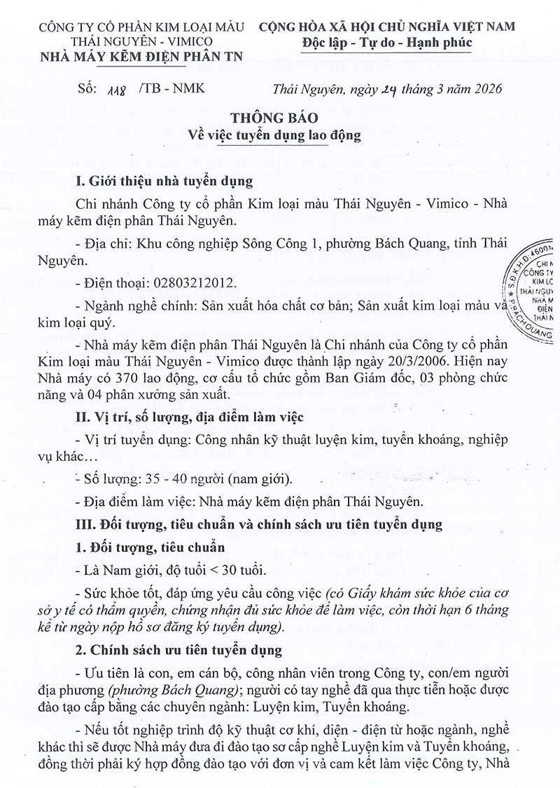 Nhà máy kẽm điện phân Thái Nguyên tuyển dụng lao động