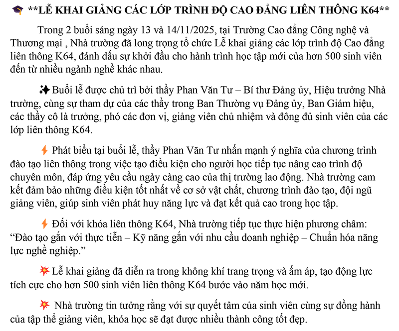 🎓 **Lễ khai giảng các lớp trình độ cao đẳng liên thông k64**